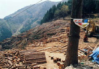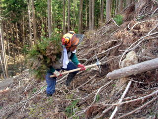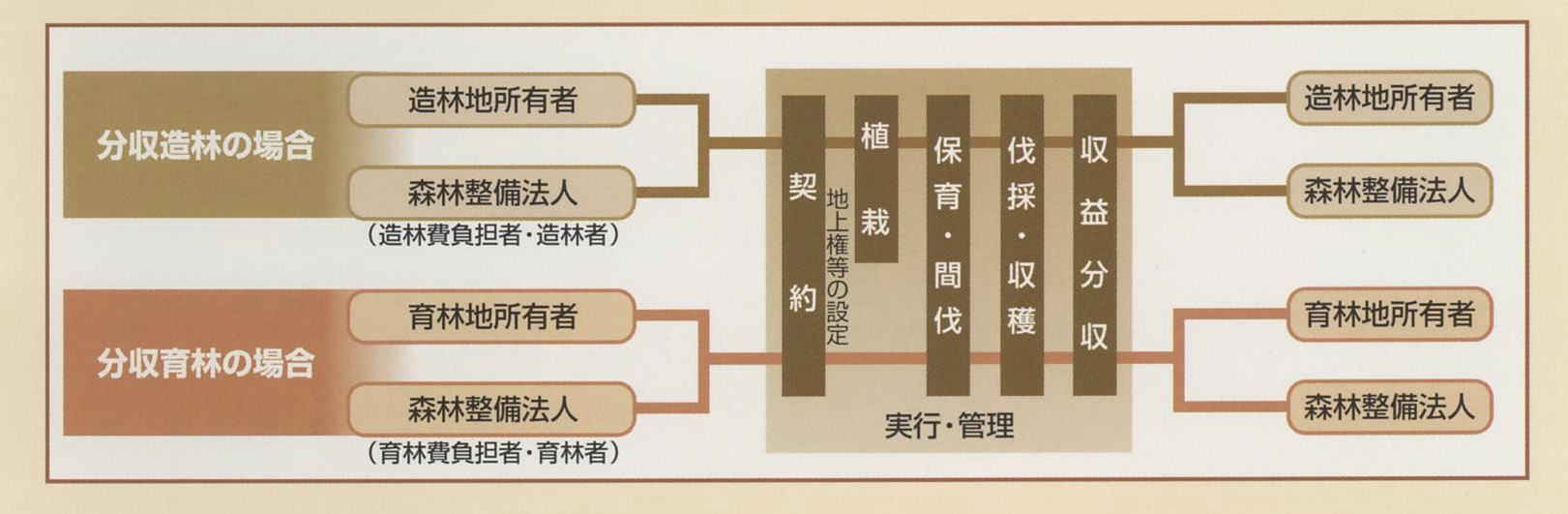 分収造林は、土地所有者が造林ができない山林を農林公社が造林者となり、植栽、保育管理を行い、伐採時の収益を分け合うものです。