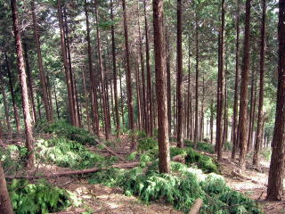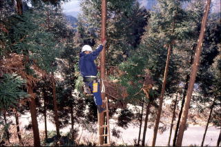 分収育林は、手入れが行き届かない、また遅れているスギ・ヒノキの人工林(林齢が35年生以下)について公社が育林者となり、所有者に代わって間伐等の保育管理を行い、伐採時の収益を分け合うものです。