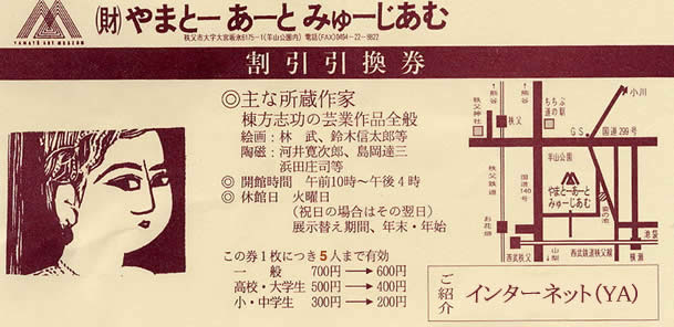 ■やまとーあーとみゅーじあむ割引券 ホームページを閲覧していただいた お客様に、 割引券をご用意しております。 右の画像をクリックしますと、 大きな画像を見ることができます。 そちらを印刷し、受付の際にご提示ください。 1枚につき5名様までご利用になることができます。