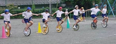 本校は全校で行う競技・演技がとても多いです。何通りもの並び方、やり方を覚え 練習しました。高学年のリード、低学年のがんばりが見事です。ある日、乗れなかっ た子が一輪車に乗れるようになり、本人もびっくり。みんなから大きな拍手をもらいました。子どもの成長はすごいです。今までの練習が報われて、突然壁を越える時、 毎日一生懸命練習してきた自分に自信が高まるときです。