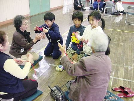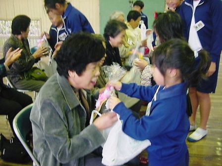 今年もにぎやかにご長寿との交歓会 1 遊び 2 パンジー苗のプレゼント 3 ふれあい給食