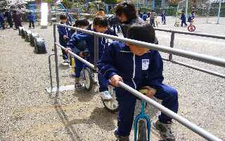 <マイ一輪車が決まりました> <本の貸出でにぎやかな図書室です>