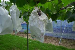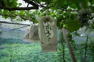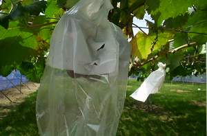 ハクビシンは 口でぶどう袋を食い破り 食餌をする。 丈夫な袋をぶどうに掛けることにより 食害が防止できるのではないかと仮定をして 普通の紙袋 ポリプロピレン袋 不織布の袋 厚紙袋2種の5種類で 被害の有無や食い破り方を見た。
