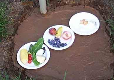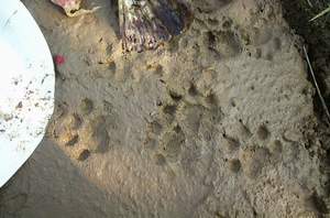 実施場所はぶどう園内で ハクビシンが来たことを確認するため 餌のまわりの土を水で練ってやわらかくしておき足跡で確認する。