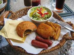 東京カレーパンなるものと ポテトフライ ウインナーの太いやつ サラダの内容。