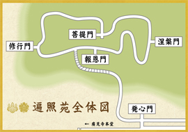 平成13年より15年まで、当寺観音講によって四国八十八ヶ所巡拝が行なわれました。 その満願の記念事業として作られました。八十八ヶ所を発心門(徳島県)、修行門(高知県)、菩提門(愛知県)、涅槃門(香川県)の4つに分け、巡礼道(約800メートル)で結んでいます。 |